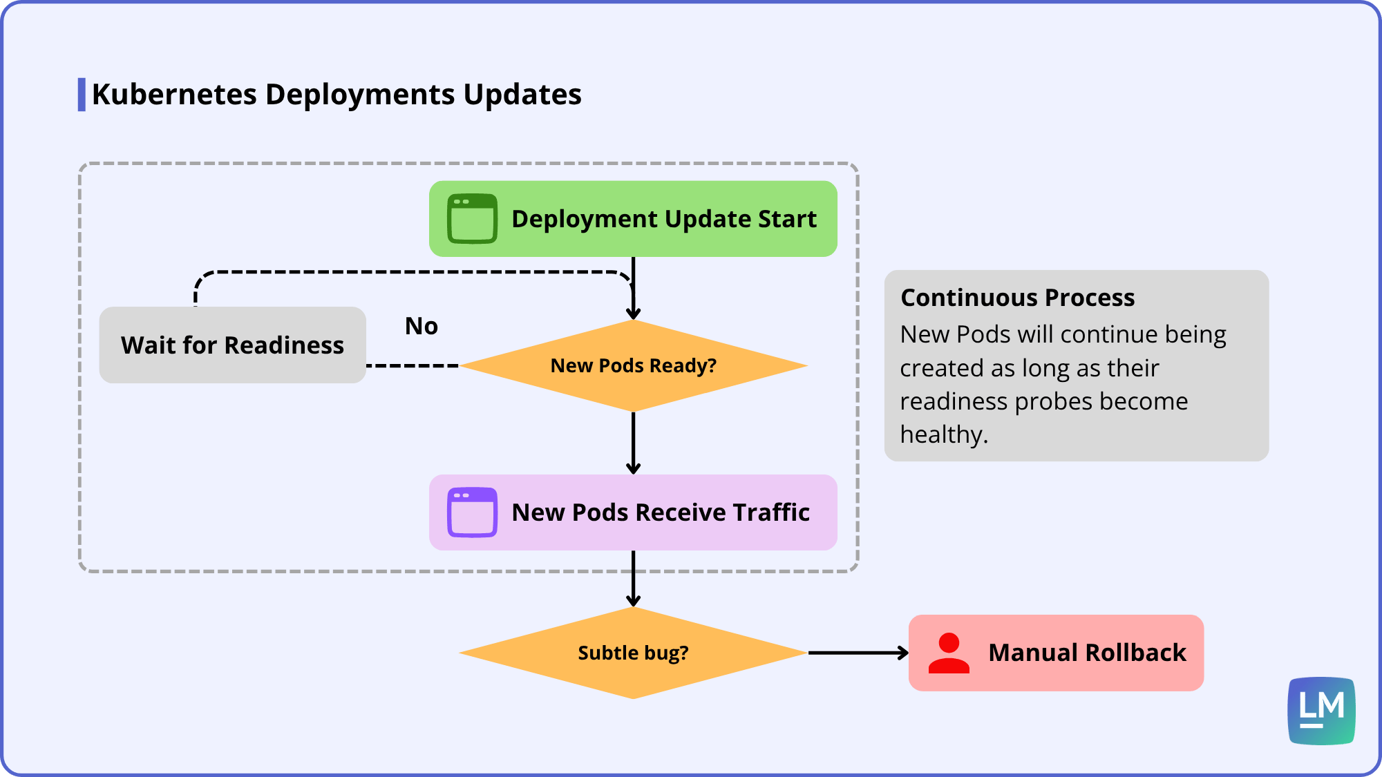What do I mean by that? Once a rolling update starts, Kubernetes keeps moving as long as readiness allows it. If something subtle breaks, the usual response is manual rollback, which is just another rolling update in reverse. There is no pause, there is no possibility of human approval, and there surely isn’t any automated analysis running.
